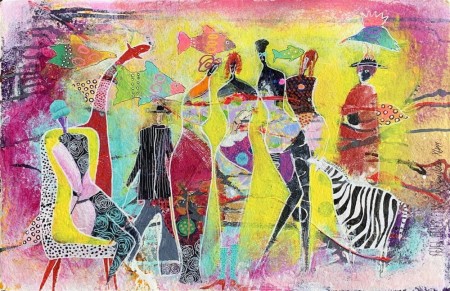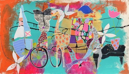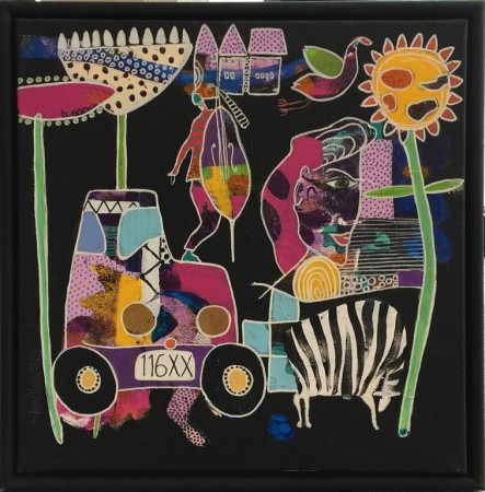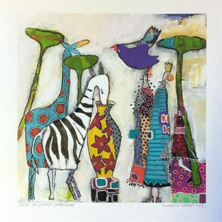 abstraherte og forenklede landskap. Fantasifulle dyrefigurer forekommer også ofte, gjerne som observatører av eller kommentatorer til