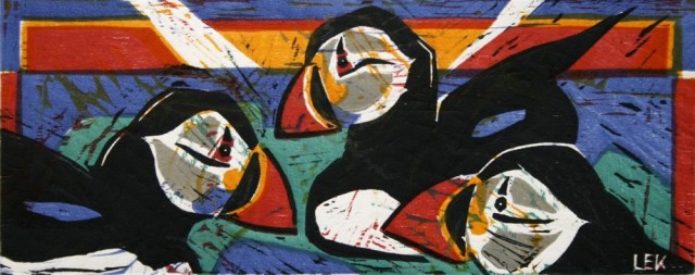 Lars Erik Karlsens  tresnitt  har et sterkt personlig uttrykk. Kunstneren bruker landskap og sjøfugler som utganspunkt for sine bilder. Tresnittene fungerer på to plan. På avstand er de figurative, men på nært hold kan de synes som fargerike, abstrakte komposisjoner.